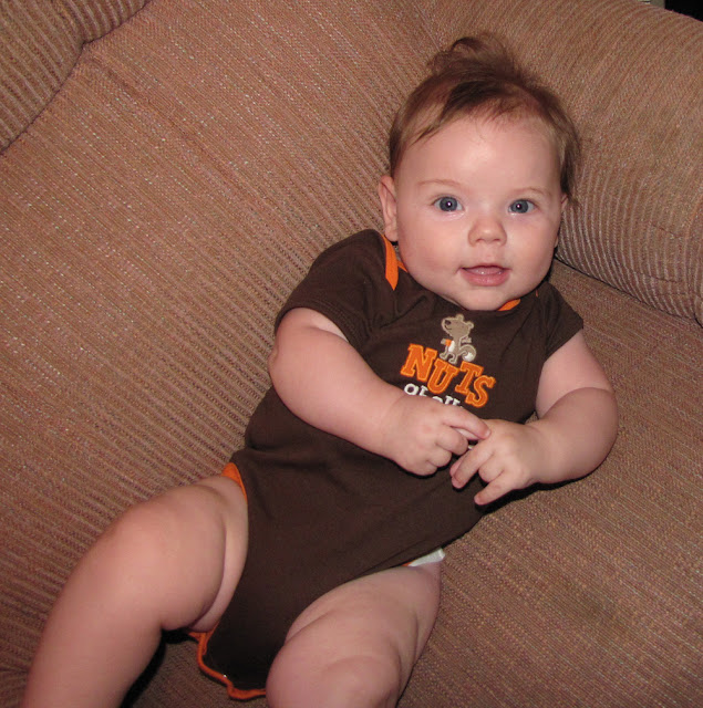 He also disregards all my begging for him to stop growing. He might be 4.5 months old now, but wears 9 month outfits! A doctor appointment earlier this month put him at 18 pounds and 12 ounces. I'm sure he's over 19 pounds now. My back would have given out a long time ago if it weren't for chiropractor visits. :)